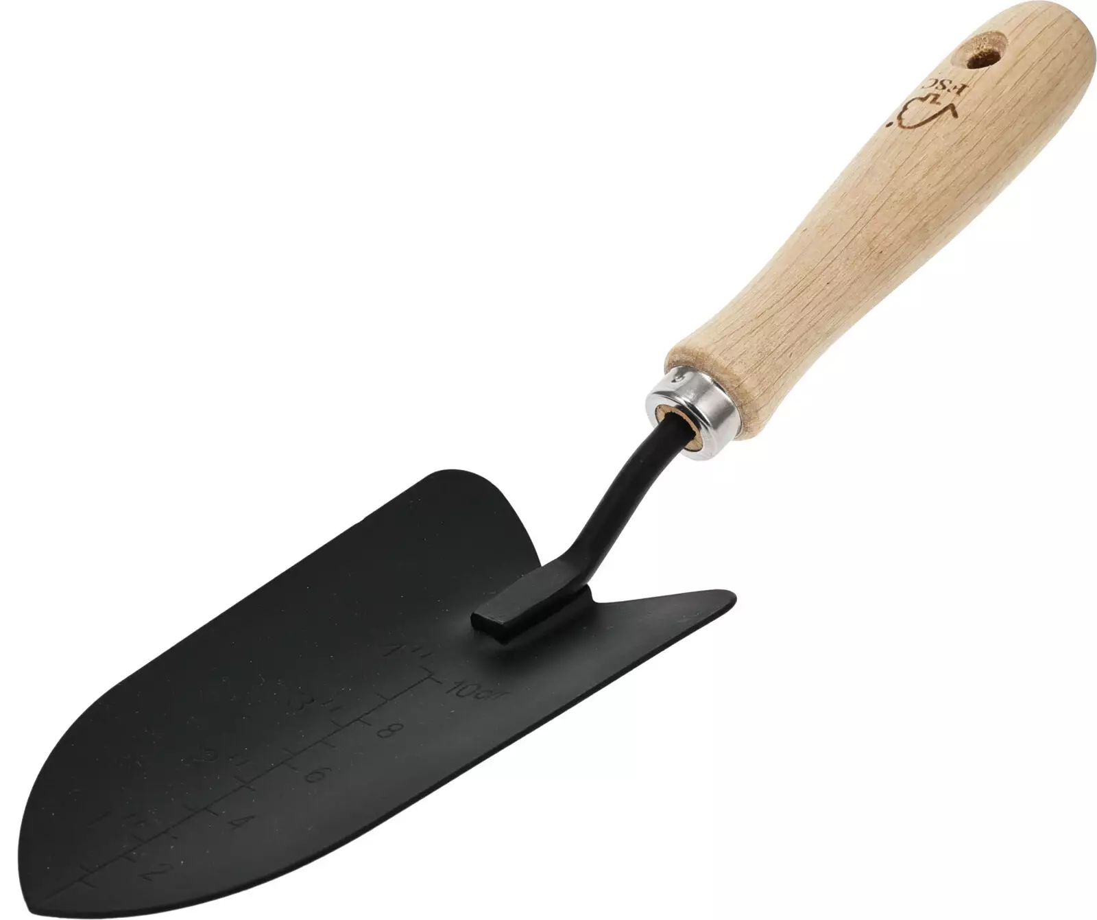 svart metallisk trädgårdsplanteringsspade med trähandtag - mått: 32,5 x 8,5 cm