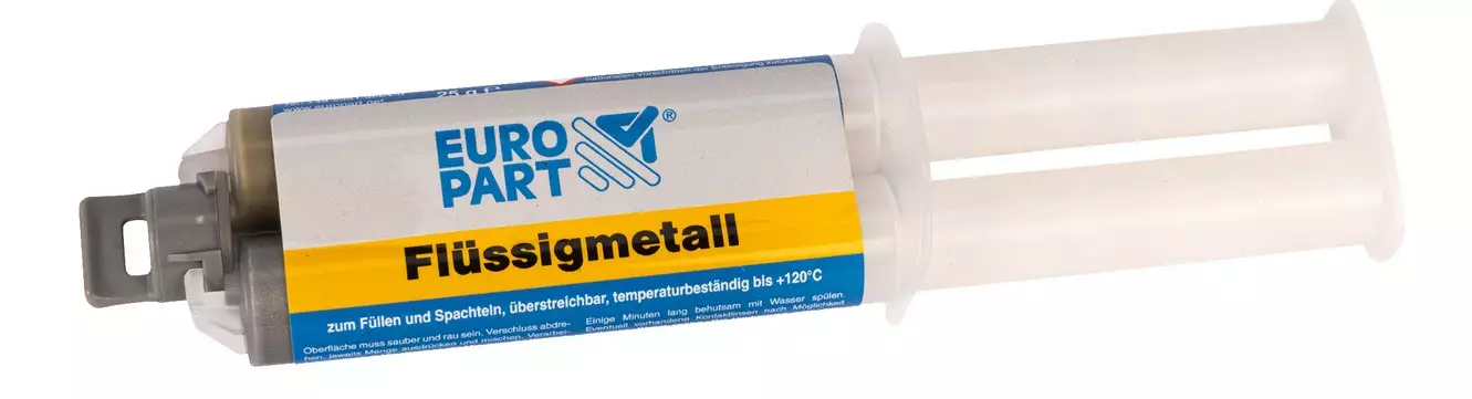 2-komponents kemisk metall 25ml För fyllning och limning, målningsbar, tålig mot oljor, vatten och många kemikalier, kan bearbetas mekaniskt (slipning, borrning, sågning, fräsning), fyller sprickor och hål, saknade hål och blåshål, möjliggör reparation av trasiga gängor, rör, vattentankar, radiatorer, stuprör, simbassänger, bilkarosser och maskindelar, limgap för lager ca 2-3 mm. Stål, järn, gjutjärn, aluminium, metalllegeringar, keramik, betong, trä m.m. Kan blandas med medföljande blandningsmunstycke och utan Värmetålighet -40 - +120 °C