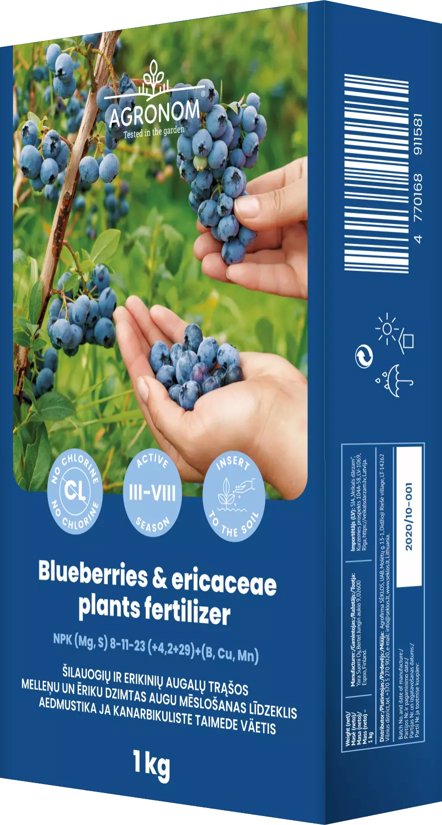 Gödsel för blåbärsbuskar. Granulerad, klor-fri universalgödsel för surjordsplantor: blåbär, tranbär, lingon, ormbunke, växter inom familjen Ericaceae, såsom; rhododendron, azalea, hortensia, ljung, och klockljung. Sikta på att gödsla noggrant genom att rikta gödslet mot rotområdet. Håll rotområdet välbearbetat och använd täckmaterial för bästa resultat. Förbättra växtmediets surhet med syrabildande material; spån, bark, tallnålar osv. Den mest aktiva rotzonen finns i det område som bildas av topparna på buskars och träds grenar. Tillsätt gödsel en gång innan plantering och 2-3 gånger under växtsäsongen: första gången i början av växtsäsongen, följande gång efter blomning före skörden av frukten och sista gången efter skörd. Vattna efter gödsling. Gödselmängder: Blåbär; 1 msk/ m². Unga rhododendron, azaleor, hortensior, ormbunkar; 2 msk/ m² och motsvarande gamla buskar 3 msk/ m². Växter inom familjen Ericaceae och ljung; 1 msk/ m². Prydnadsbuskar som tål sur jord, beroende på buskens storlek; 1-2 msk/ m². Mångsidig näringskomposition: N-P-K; 8 – 11 – 22 + Mg 4 och S 29 (+ B, Cu och Mn). Produktförpackning: mått: 12,5 cm (b) x 21,5 cm (h) x 5,0 cm (d) vikt: 1,00 kg Tillverkningsland: LITAUEN