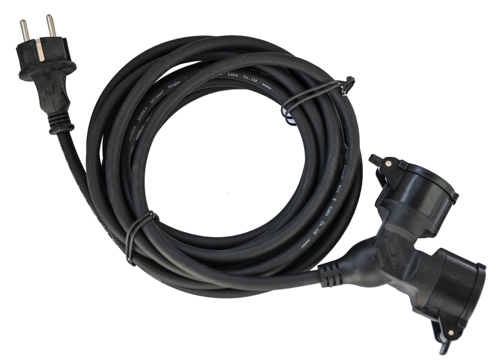 Matade gummikablar för inomhus- och utomhusbruk. 3- och 4-delade förlängningssladdar med grenuttag kan hängas på väggen. Barnskyddad produkt. 1-delade långa gummikablade förlängningssladdar för trädgårdsarbete och renoveringar. Långa fatanslutningar är praktiska vid renoveringar och trädgårdsarbete när du vill föra strömmen långt till två elektriska apparater. Tjocka gummikablar och fatanslutningar är även avsedda för utomhusbruk för proffs. - 2-del.- y-modell- längd 5 meter- IP44