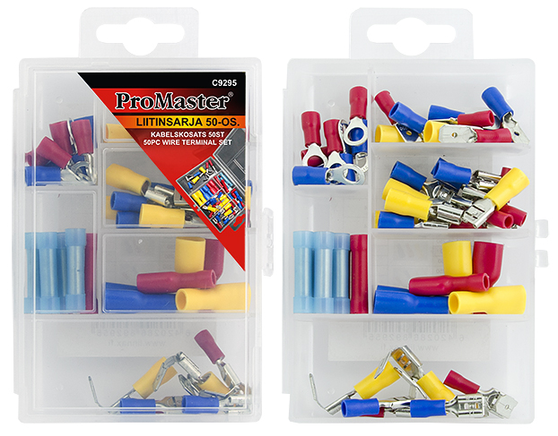 Setet med 50 delar innehåller följande kontakter: Halvisolerad golvanslutning - 4 st röd FDD1.25-250 - 4 st blå FDD2-250 - 4 st gul FDD5.5-250 Halvisolerat golvstickpropp - 4 st röd MDD1.25-250 - 4 st blå MDD2-250 - 2 st gul MDD5.5-250 Ringkontakt - 4 st röd RV1.25-5 - 4 st blå RV2-5 Förlängningshylsa - 4 st röd BV1.25 - 4 st blå, limmat krympslang BNYF2 Isolerad golvanslutning - 2 st röd FDFD1.25-250 - 2 st blå FDFD2-250 - 2 st gul FDFD5.5-250 Halvisolerad fördelningskontakt - 2 st röd FBDD1.25-250 - 2 st blå FBDD2-250 - 2 st gul FBDD5.5-250