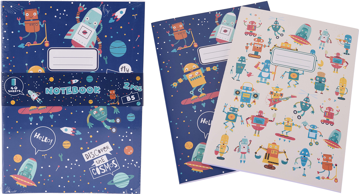 förpackningen innehåller 2 stycken robottematiska anteckningsböcker - storlek: A5