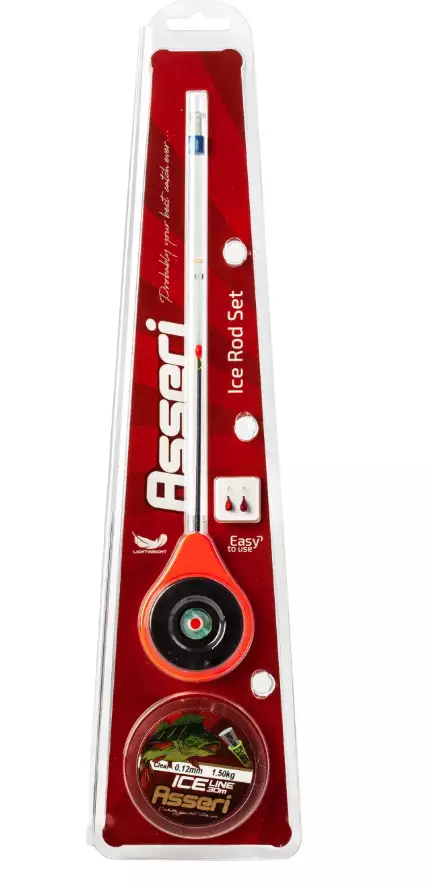 Klassisk isfiskeangeld med spole i Balalaikka-stil.Isfiskelina och 2 mormyska-bait ingår.