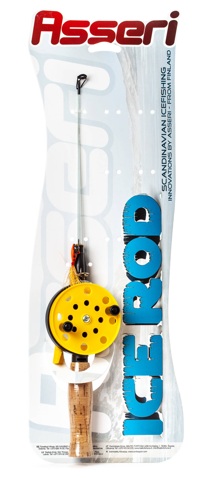 Pilksättet innehåller en Asseri Kianta isfiskerulle med korkhandtag, fiskevirke färdigtrasslat med monofilament och ett balanspirk.