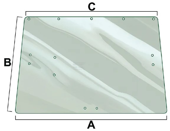 Bakruta för John Deere SG2-kabiner. - längd A: 1 270 mm - längd B: 830 mm - längd C: 1 134 mm - tjocklek: 6 mm - motsvarar del: John Deere L36606 Passar följande traktorer: - John Deere 1550, 1640, 1750, 1850, 1950, 2040, 2040S, 2140, 2250, 2450, 2650, 2850, 3040, 3050, 3140, 3350, 3640, 3650, 4030, 4055, 4230, 4250, 4255, 4430, 4450, 4455, 4630, 4650, 4755, 4840 och 4955