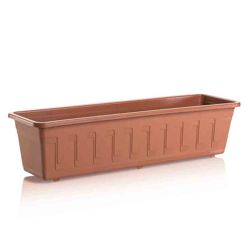 Kvalitets balkonglåda med stabil kant. - behåller sin form utan att böjas - färg brun - val av bredder 60 cm eller 80 cm - material plast - passande fästen: se kompatibla produkter