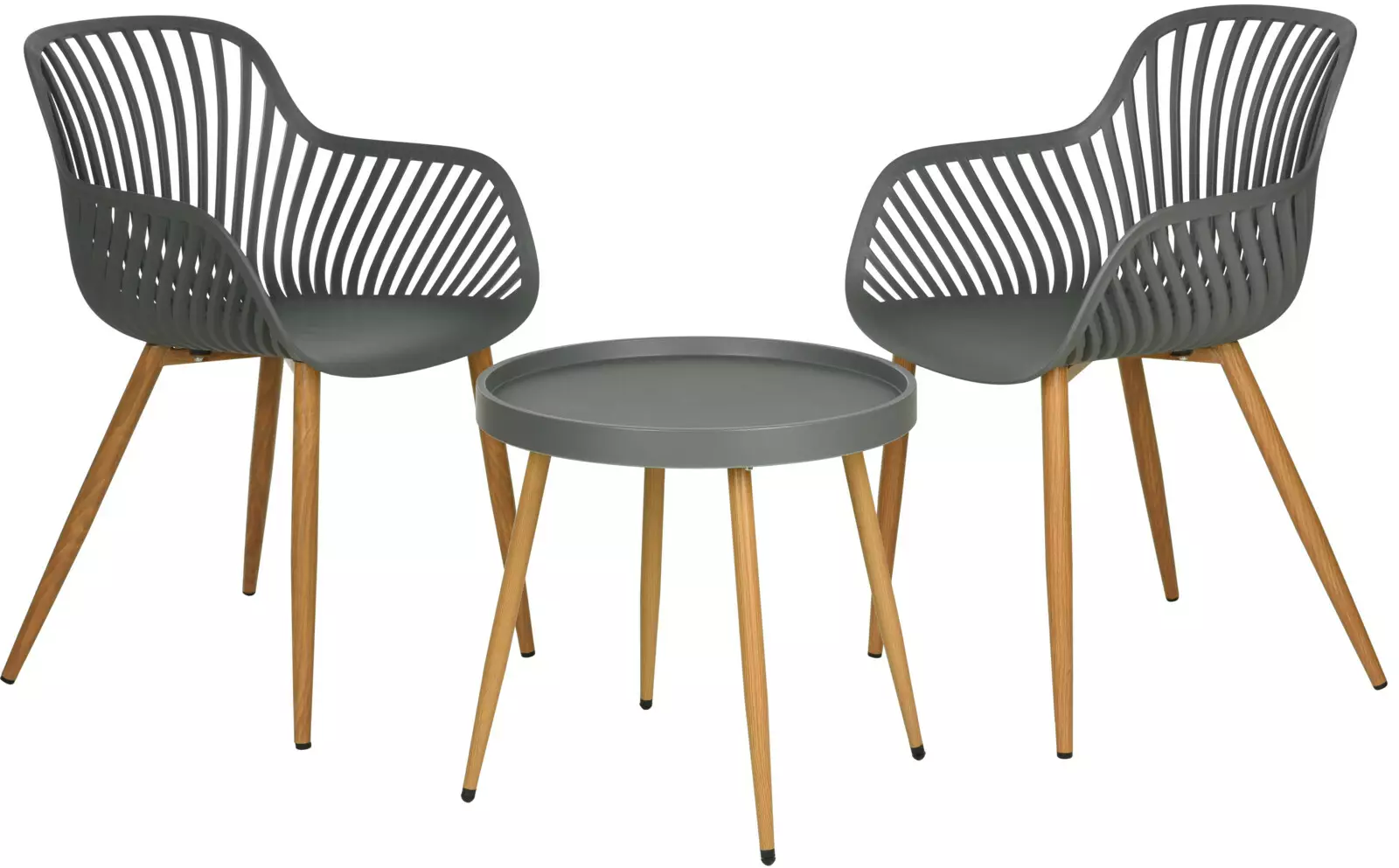 - 3-delad balkongset innehåller ett bord och 2 stolar - Sitthöjd: 56 x 55 x 84 cm - Bordstorlek: Ø 49,5 x H 47,5 cm - Material: Grått återvunnet polypropen för sits och bord (GRS), stålfötter som ser ut som trä. - UV-skydd: PP-materialet är utrustat med UV-skydd, vilket gör att möblerna tål väderväxlingar och behåller sin färg. - Maxvikten för sittplatser är 150 kg, bordet 50 kg. - Rördiametrar: sitsar 32 mm, bord 25 mm. Rörtjocklek: sitsar 1 mm, bord 0,9 mm.