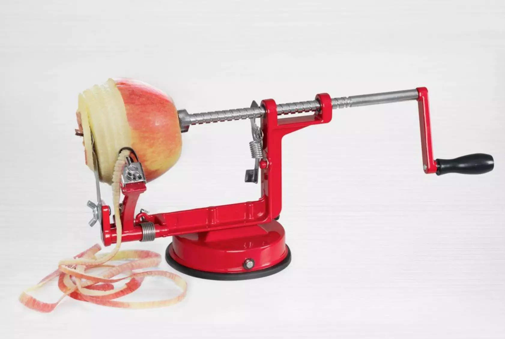 Äppelskärare som enkelt tar bort kärnor och skal från äpplen. Maskinen skivar även äpplena om så önskas, en utmärkt hjälp för alla som gillar äpplen och äppelträdägare. Den har en kraftig sugkopp på undersidan som gör att den sitter stadigt på exempelvis köksbordet. Bredd27 cmDjup11 cmHöjd14 cmVikt0,47 kgFärgred/silver/svartMaterialzinkblandning, järn, TPR, rostfritt stål 430, aluminium, rostfritt stål 201, polypropylen