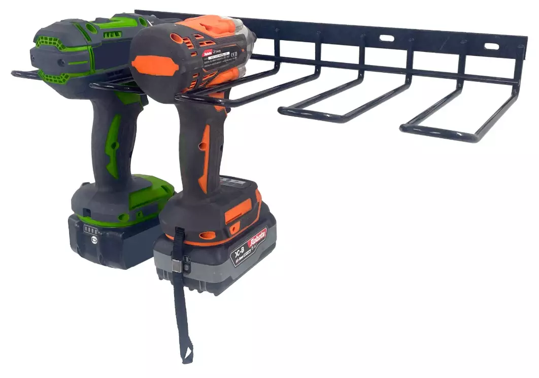 Robotens batteridrillställ gör det enkelt och ordnat att förvara borrmaskiner och deras batterier. Regalet har tre våningar; de nedersta platserna passar borrmaskiner, medan de två övre...