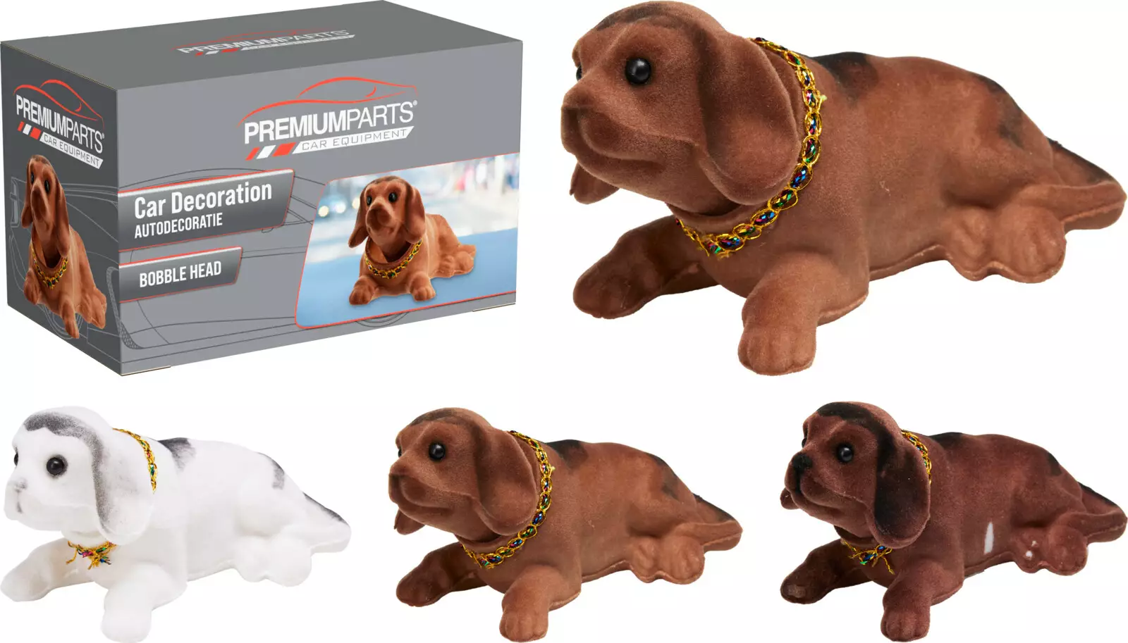 Bilprydnad viftande hund - mått ca 15 x 8 x 9 cm - tillverkad av plyschplast - med "guld" krans - i sortimentet finns bruna och vita hundar, du får någon av dem vid beställning. Ingen valmöjlighet i webbutiken.