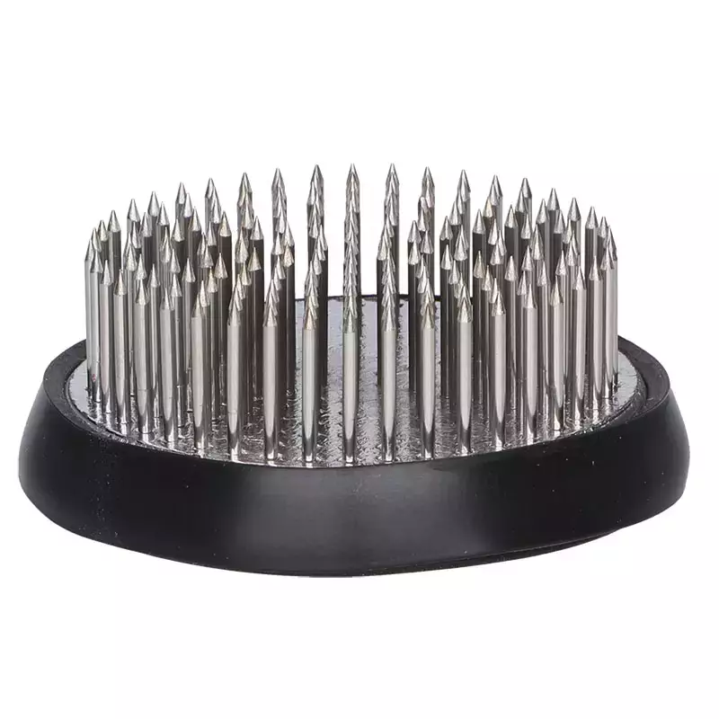 Blomsterfäste (blomsterhyvel, kenzan) används för att arrangera snittblommor och torkade blommor. Används bland annat i ikebana blomsterarrangemang. Blommor, grenar, blad och annat material sätts fast i blomsterfästet genom att trycka dem mot piggarna. Metalliskt, runt blomsterfäste med en diameter på 60 mm. Material: rostfritt stål, gummi. Bredd: 6 cmDjup: 6 cmHöjd: 2,5 cmVikt: 0,25 kgFärg: svart/stålMaterial: rostfritt stål SS304, gummi