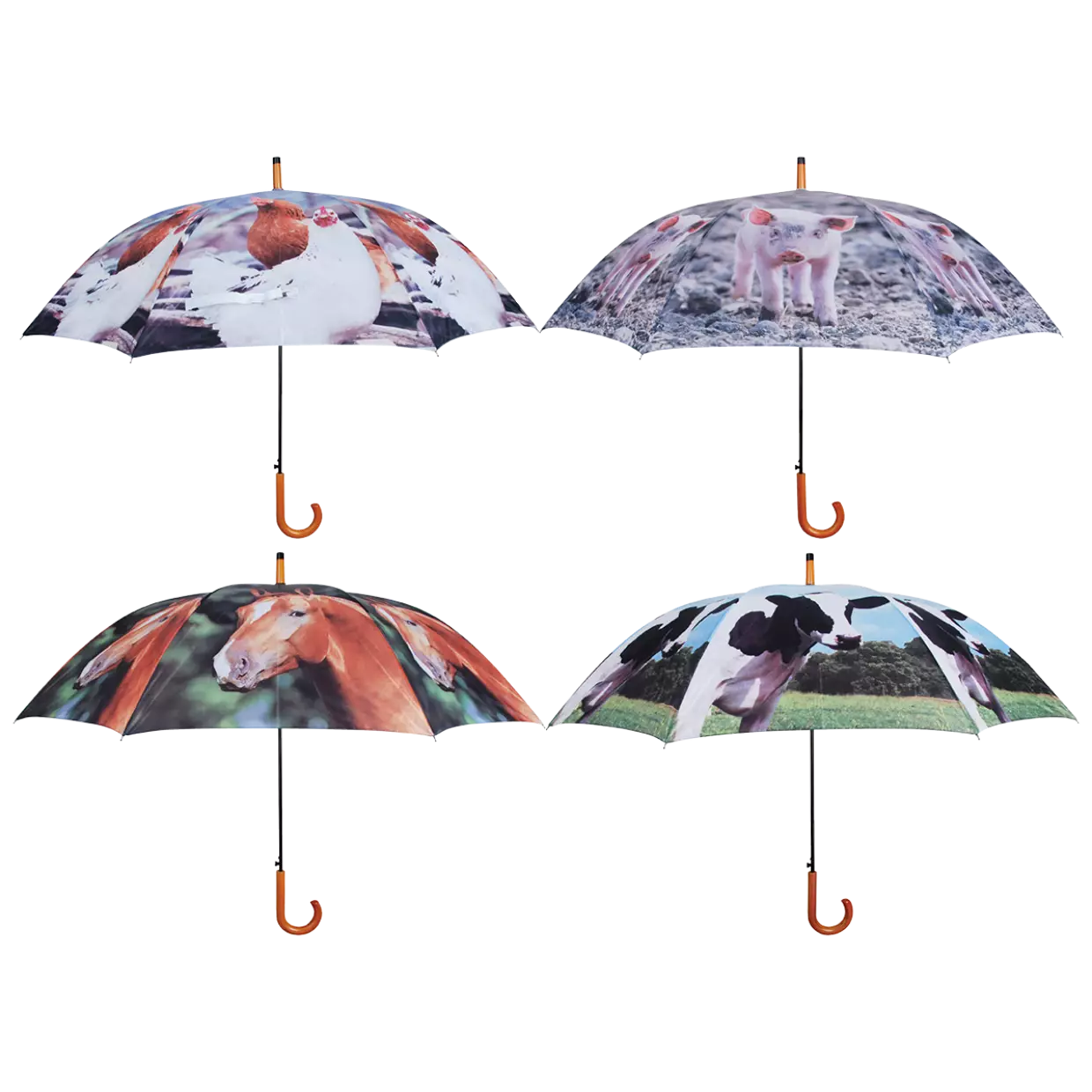 - paraply med motiv av gårdsdjur - i sortimentet finns häst, gris, ko och höna, du får en slumpmässig utvalda, tyvärr kan motivet inte väljas - diameter 120 cm - längd 96 cm - vikt 0,43 kg