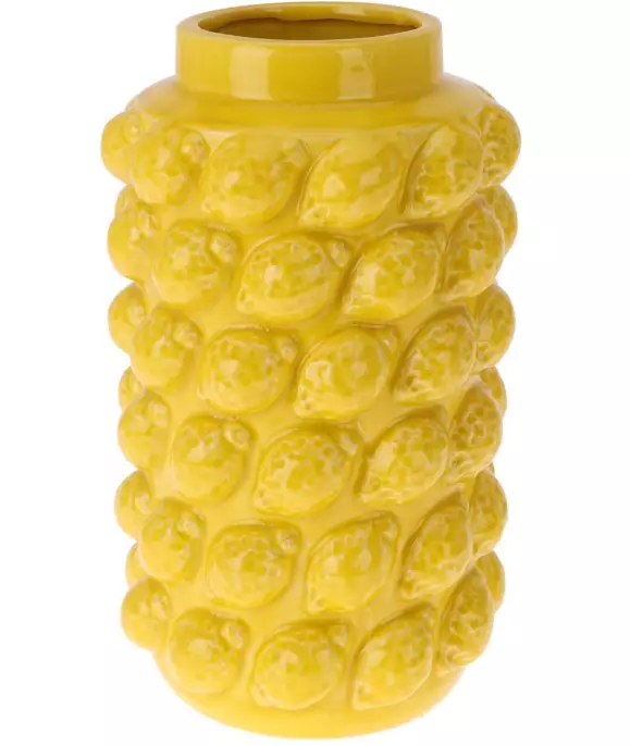 Vacker keramisk blombukett med lekfulla citronmönster. En riktig ögonfångare i vilken inredning som helst. Den pigga gula färgen och den detaljerade fruktdesignen ger ett fräsch och glatt utseende till vardagsrummet, köket eller middagsbordet.Passar för en blomsterbukett eller som dekoration för sig själv. Höjd: 26 cmDiameter: 16 cmVikt: 1 kgVolym: 3,2 liter