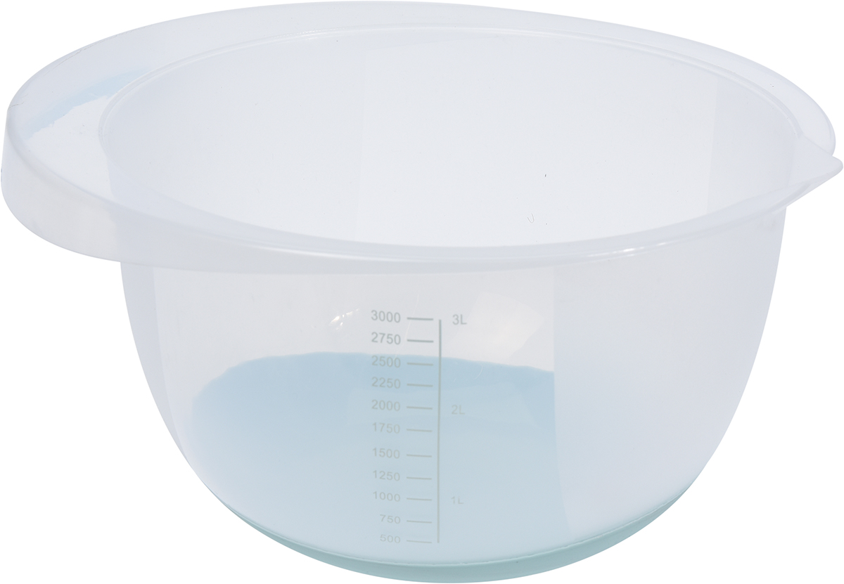 genomskinlig degskål / vispskål med måttskala- halkfri botten- volym 3 liter- mått: 268x250x137 mm- vikt ca 200 g