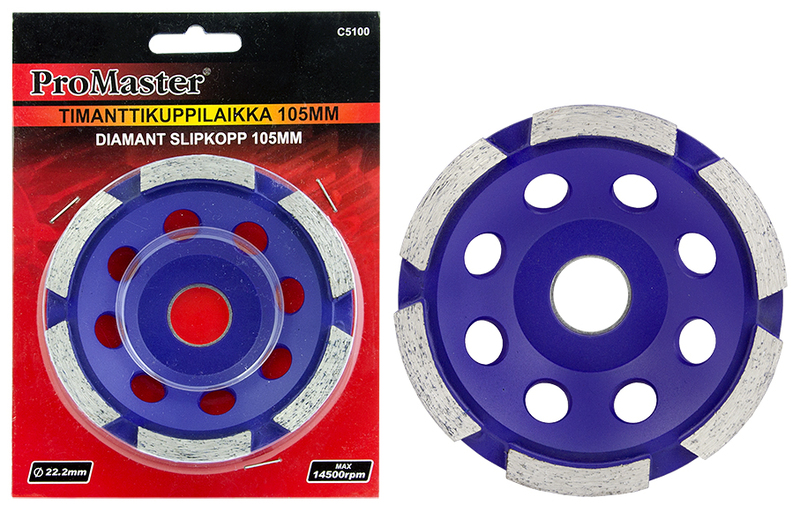 Ensatsad diamantkopp för torkslipning, med 6 slipmedel (var och en 38 x 5 x 8 mm). - skivans diameter: 105 mm - upp till 14 500 varv/minut - centrumhålets diameter: 22,2 mm (7/8\")
