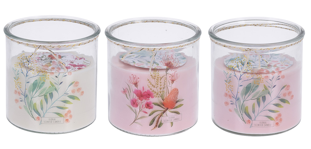 Stor blommotiv doftljus - glasburk - vikt 430 g - diameter 12 cm - höjd 12 cm - finns i 3 färger (som på bilden) varav du får en slumpmässig vid beställning (mixad produkt)
