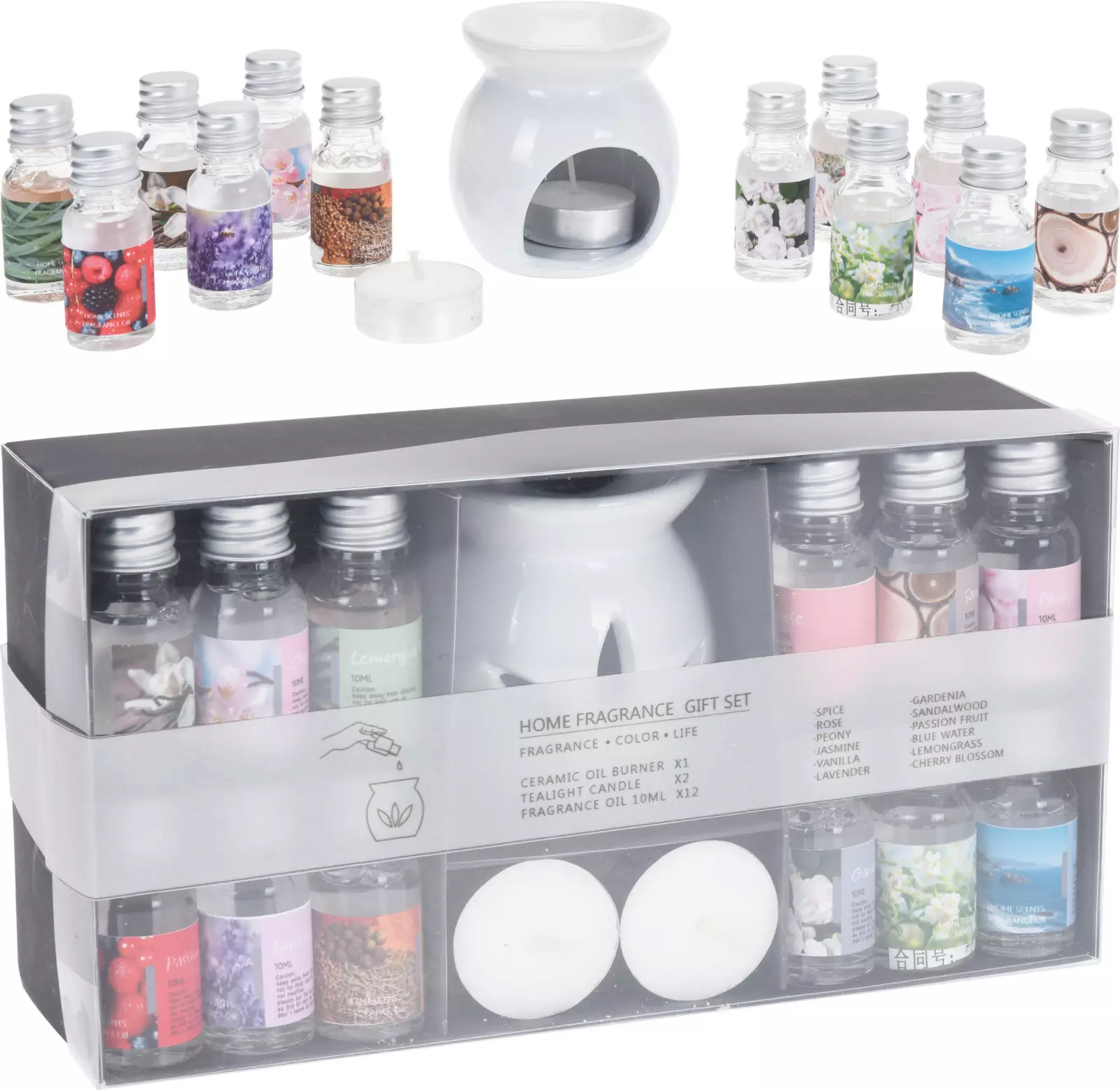 - setet innehåller: 12 olika 10 ml doftoljor, en vit ljushållare och två värmeljus - de medföljande dofterna: passionsfrukt, kryddor, pion, sandelträ, jasmin, trädgård, ros, citrongräs, lavendel, blått vatten, vanilj och körsbärsblomma