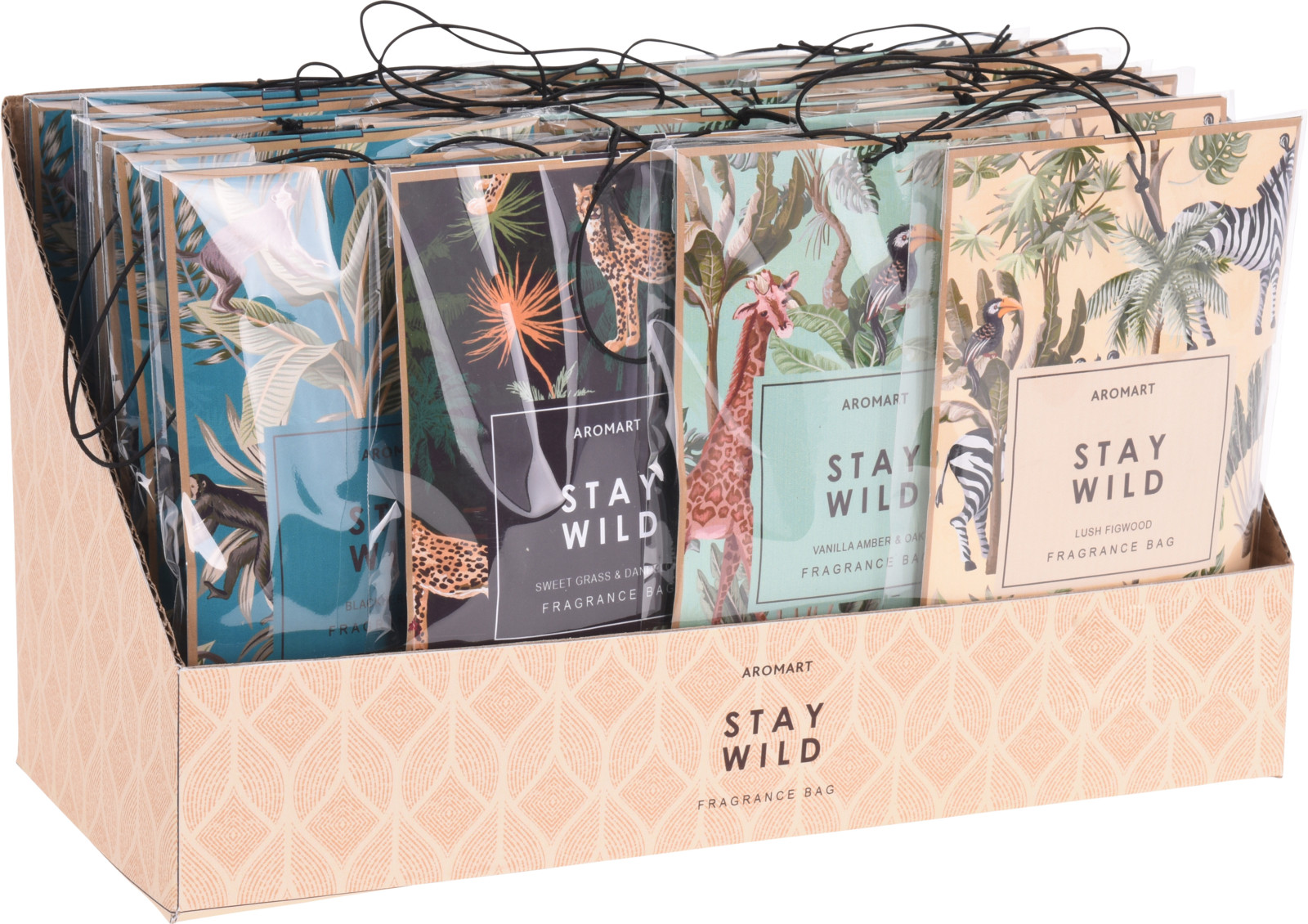 Doftpåse i vackra färger och med djungelmönster - flexibel upphängningsslinga - matt tryck med guldkant - storlek 9 x 14,5 cm Sortimentet innehåller 4 olika dofter: - petrol (apa): Blackberry Basil - ljusgrön (giraff): Vanilla Amber & Oak - gul (sebra): Lush Ficwood - svart (gepard): Sweet Grass & Dandelion