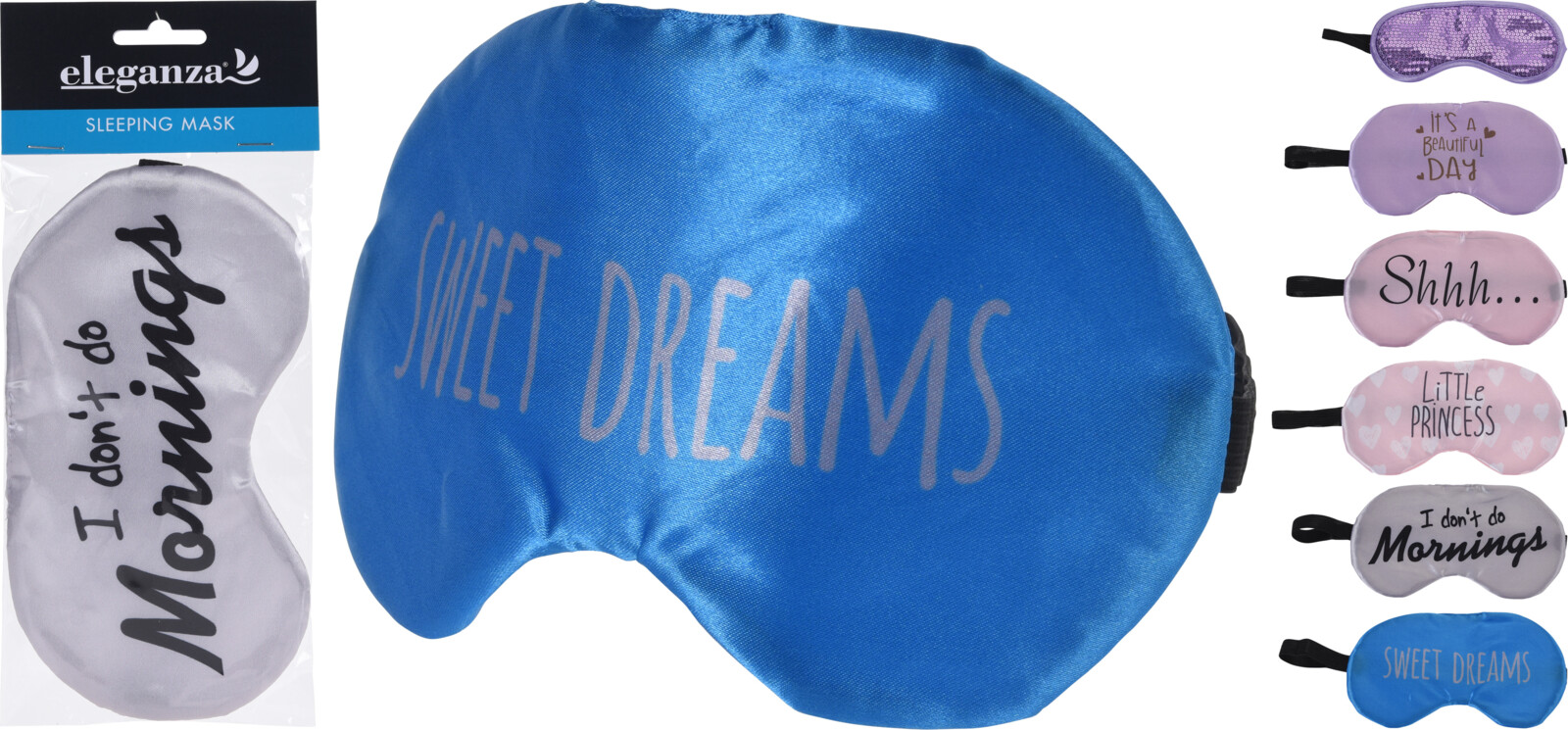 Sovmask - mjuk, med elastiskt band - storlek: 20x10 cm - 100 % polyester - 6 olika mönster/designs - 1 st / förpackning