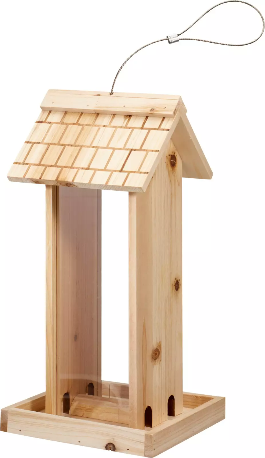 Trä foderautomat med plastakryl- 17x17 cm- Höjd 38 cm- Matt hängring
