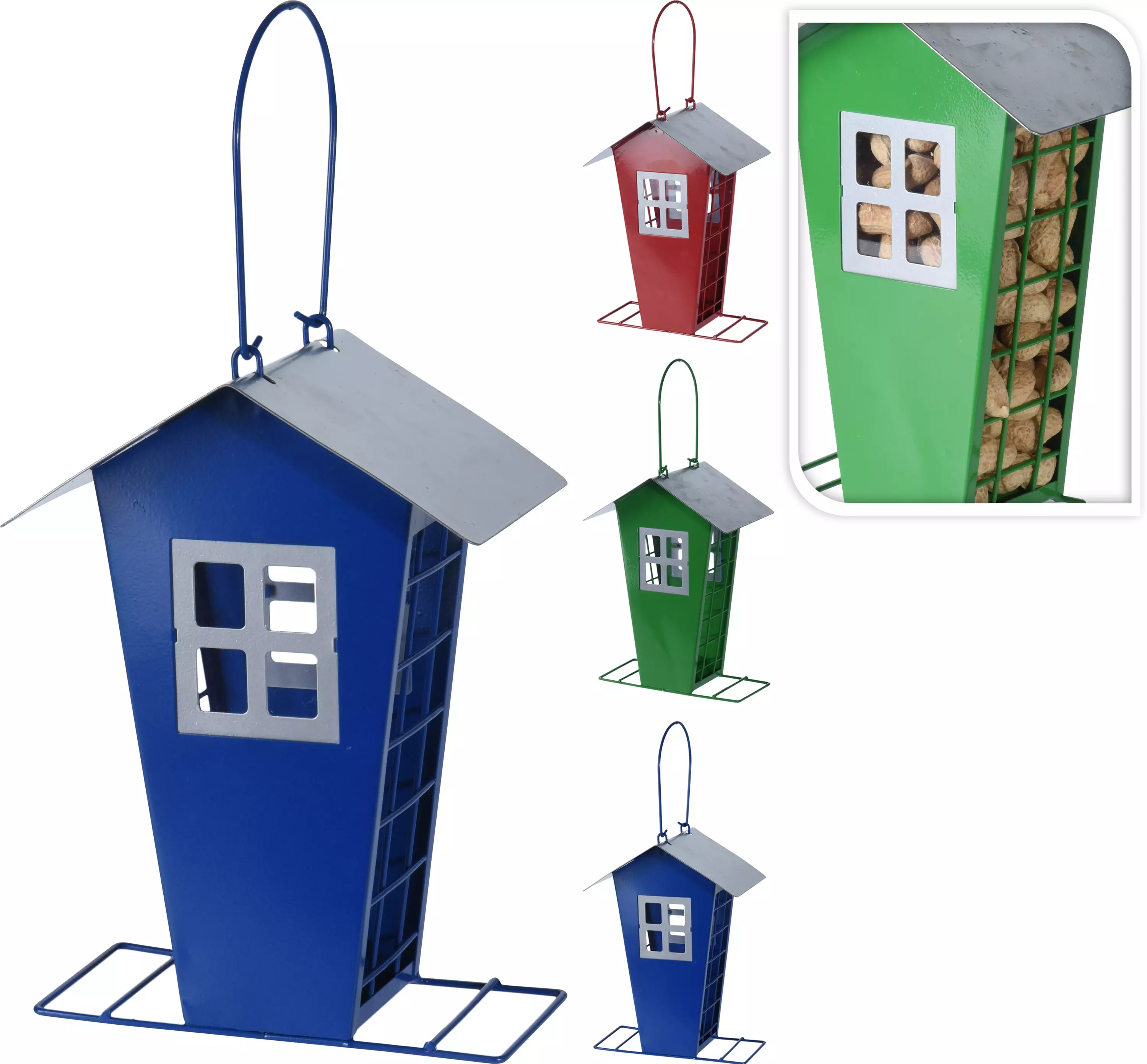 Metallisk sk birdfeeder - stor ögla på 25 mm: passar för brödskivor, äpplen, talglösa bollar, stora nötter m.m. - höjd 21 cm (utan upphängningsöga) - grön, blå och röd