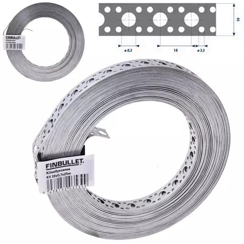 Fästeband av galvaniserat stål. Lätt att installera, passar många olika behov och utrymmen. - bredd: 19 mm - tjocklek: 0,7 mm - håldiameter: 3,3 och 8,3 mm - längd: 25 m