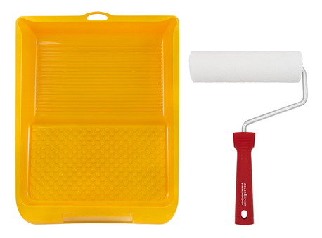 -setet innehåller: --stikkskarv 180mm --filtroller 180mm --målarfat 26 x 32cm -passar för alla inomhusfärger och lacker -särskilt bra för släta ytor -mycket slät finish -rollen kan tvättas före användning