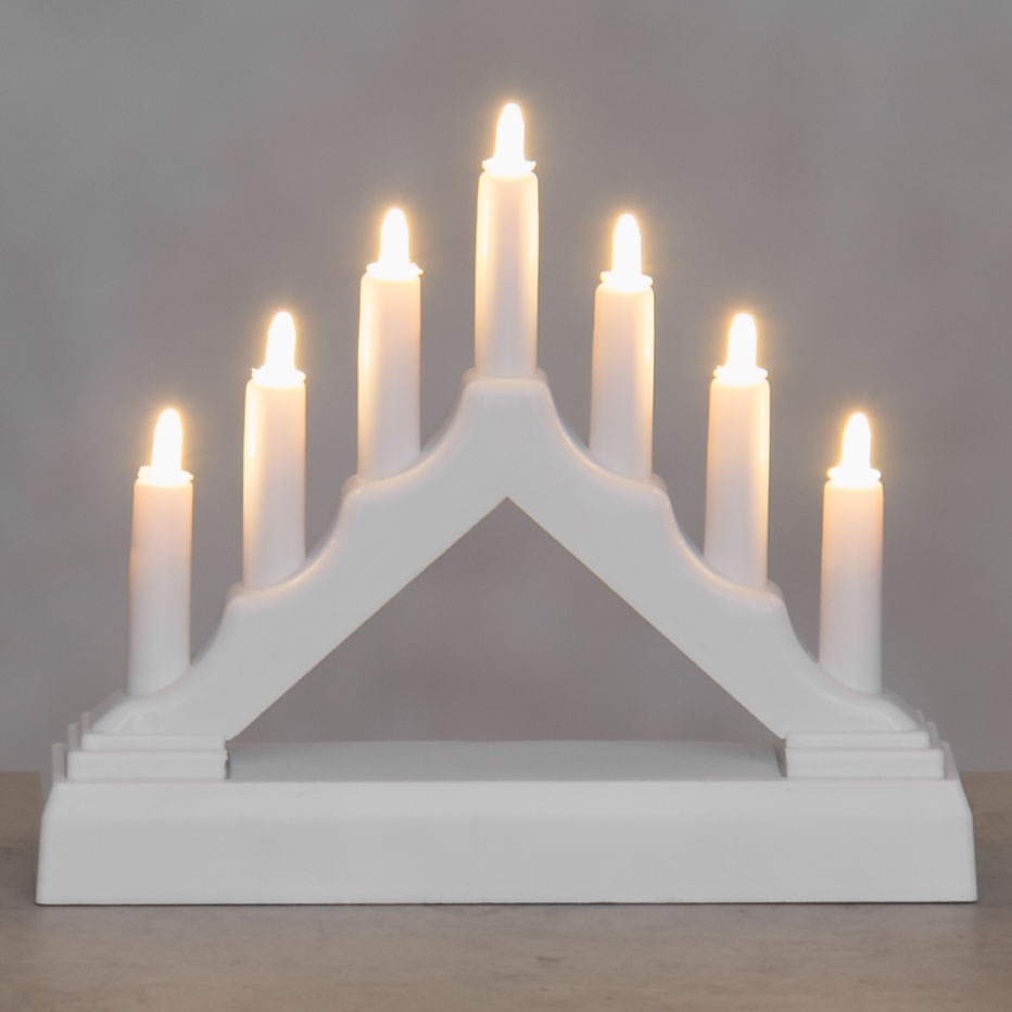 Batteridriven 7-armad ljusstake i miniatyr. Varm vita LED-lampor. Bredd15,50 cm Djup3,50 cm Höjd13,00 cm Vikt0,06 kg Färgvit Materialpolypropen Batterier 2 x AA 1,5V (ingår ej)