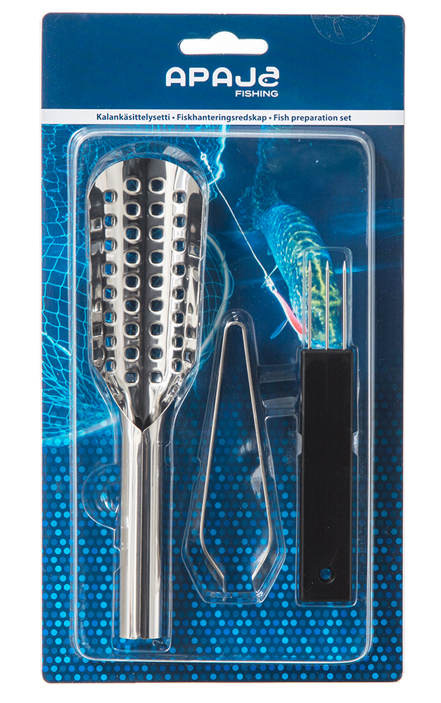 Grundset för fiskehantering! Innehåller:- skinnkniv 18,5 cm- fiskpigg 15 cm- benpincett 12 cm - material rostfritt stål, handtag av polypropen
