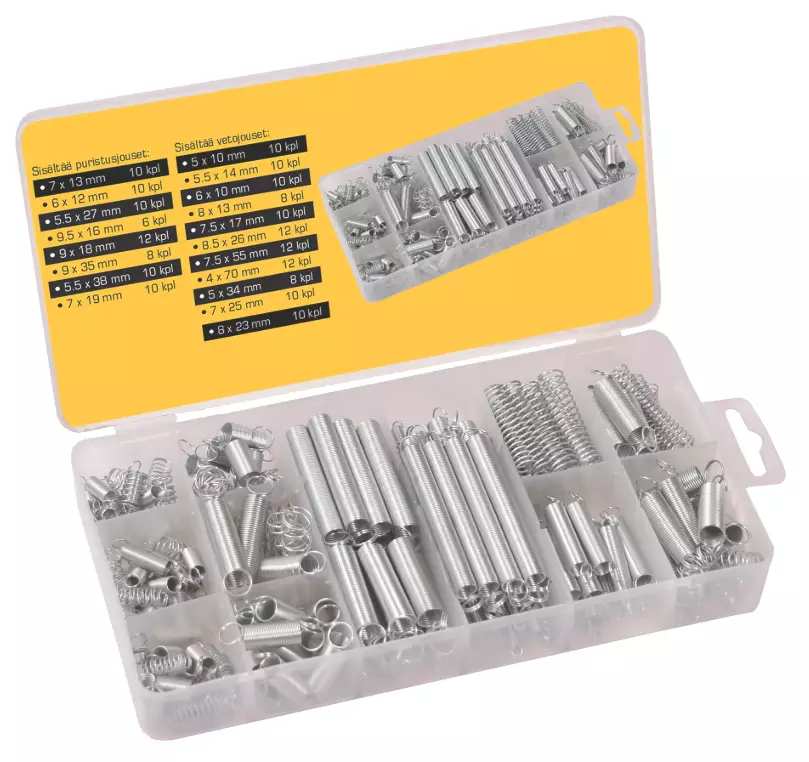 Innehåller tryckfjädrar: • 7 x 13 mm 10 st • 6 x 12 mm 10 st • 5.5 x 27 mm 10 st • 9.5 x 16 mm 6 st • 9 x 18 mm 12 st • 9 x 35 mm 8 st • 5.5 x 38 mm 10 st • 7 x 19 mm 10 st Innehåller dragfjädrar: • 5 x 10 mm 10 st • 5.5 x 14 mm 10 st • 6 x 10 mm 10 st • 8 x 13 mm 8 st • 7.5 x 17 mm 10 st • 8.5 x 26 mm 12 st • 7.5 x 55 mm 12 st • 4 x 70 mm 12 st • 5 x 34 mm 8 st • 7 x 25 mm 10 st • 8 x 23 mm 10 st Material: metall.