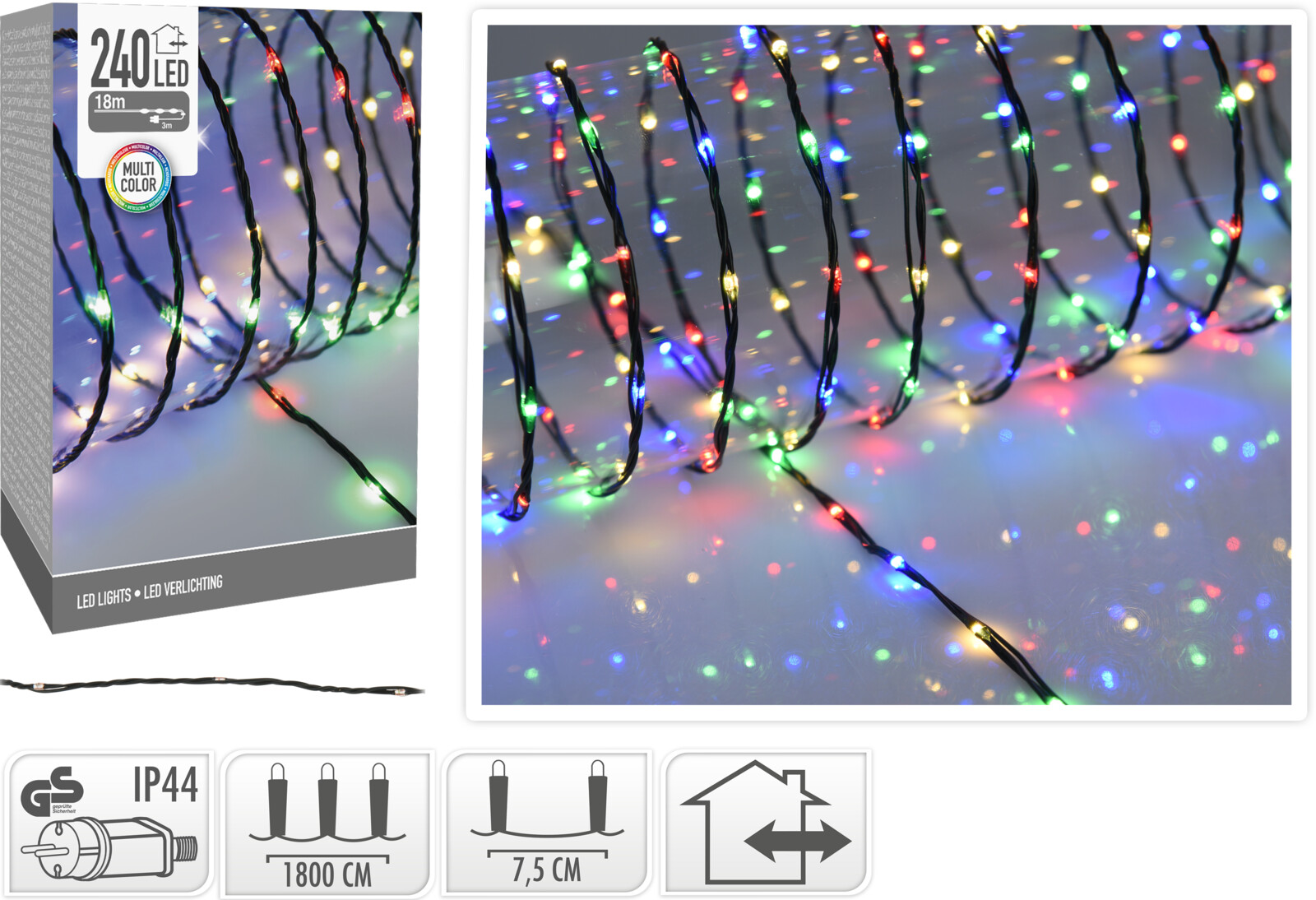 Flerfärgad LED-ljusslinga för inomhus- och utomhusbruk - 240 LED-lampor - längd 3 meter - IP 44 - avstånd mellan lamporna 7,5 cm - strömkabel 3 meter