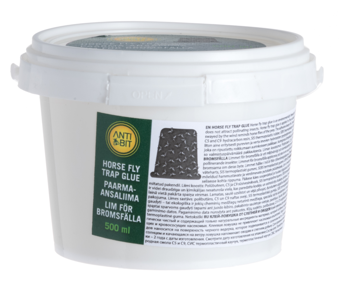 Antibetan flugklister är en miljövänlig och kemikaliefri produkt särskilt framtagen för fångst av bitande och blodtörstiga insekter. Klisteret attraherar inte pollinerande insekter. Klister appliceras exempelvis på ytan av en svart behållare som är upphängd i ett soligt läge. Den soluppvärmda och svajande fällan ser ut som byte för flugor. - förpackningens mått: 12 x 8,5 cm- vikt: 0,5 kg