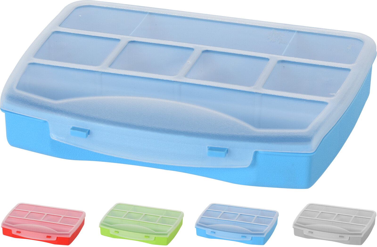 8-delad plastlåda med genomskinligt lock- mått: 19 x 16 x höjd 3 cm- vikt cirka 122 g- finns i 4 färger (i bilden), varav du vid beställning får en slumpmässig färg beroende på lagerstatus... Läs mer