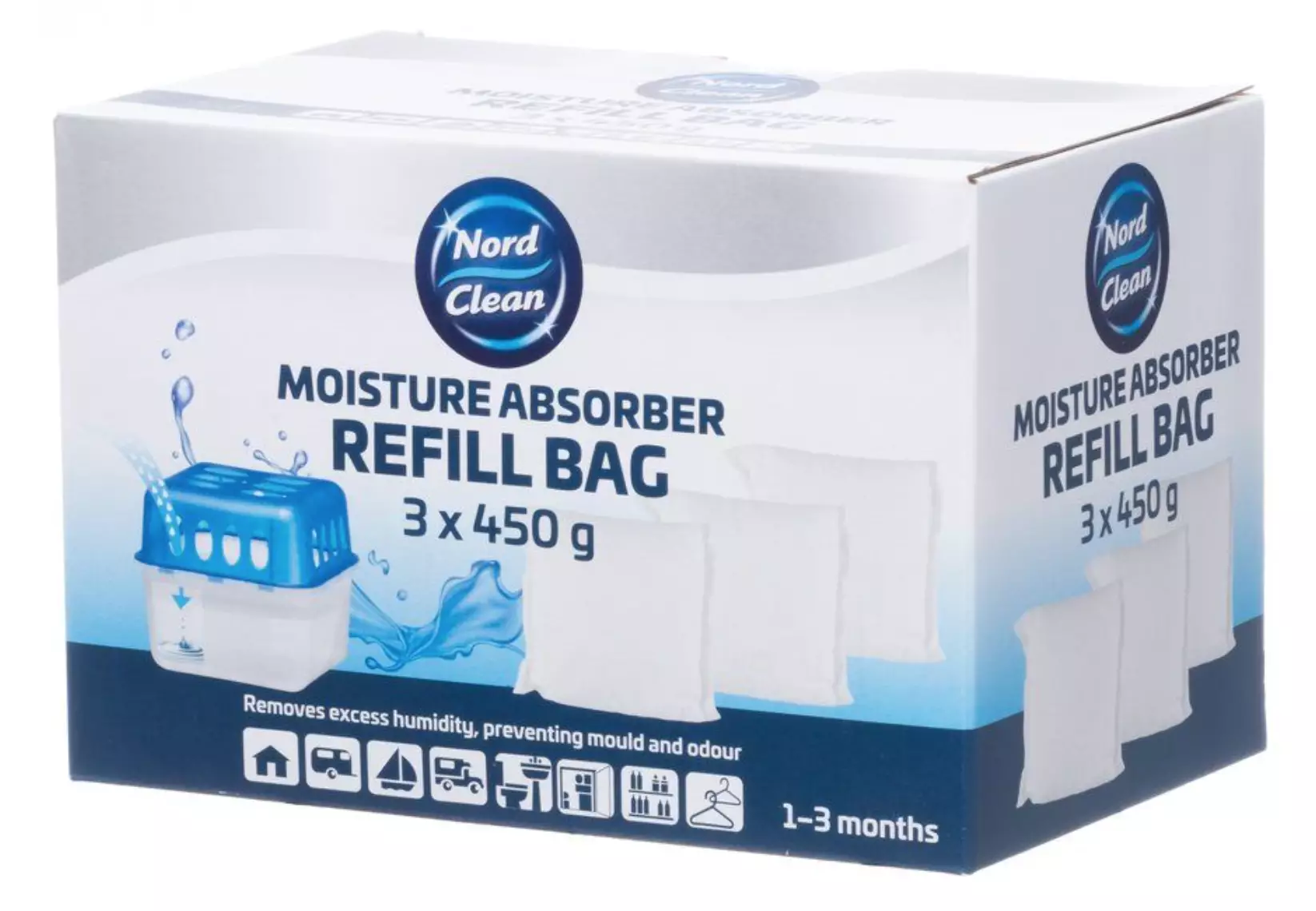 Fyllnads påsar för Nord Clean avfuktare. Nord Clean avfuktare minskar effektivt fuktighetsnivån i rummet, vilket förbättrar luftkvaliteten, minskar risken för mögeltillväxt och förhindrar obehagliga lukter och instängdhet. Kristallerna absorberar fukt från luften, vilket kondenseras till vatten i behållarens botten. När behållaren är fylld och kristallerna har använts, töms behållaren och en ny kristallpåse läggs till. Avfuktaren kan användas året runt och under alla förhållanden och temperaturer. Vid behov jämnar den ut fukten genom att binda den extra luftfuktigheten. Om luftens fuktinnehåll är lågt är saltkrystallerna i vila. Ju högre luftfuktighet, desto mer fukt absorberas av kristallerna. Avfuktaren kan användas i exempelvis bilen, båten, husvagnen, badrummet, förrådet och stugan. En påse räcker för 1 - 3 månaders användning beroende på fuktigheten och temperaturen. Förpackningen innehåller 3 x 450 g fyllnadspåsar.