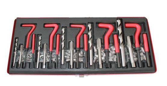 En högkvalitativ gängreparationssats för professionellt bruk för att reparera skadade och slitna gängor. Innehåller borr, gängtappar och installationsverktyg. 110 stycken gänginsatser: M5 x 0.8 x 6.7 mm M6 x 1.0 x 8.0 mm M8 x 1.25 x 10.8 mm M10 x 1.5 x 13.5 mm M12 x 1.75 x 16.3 mm
