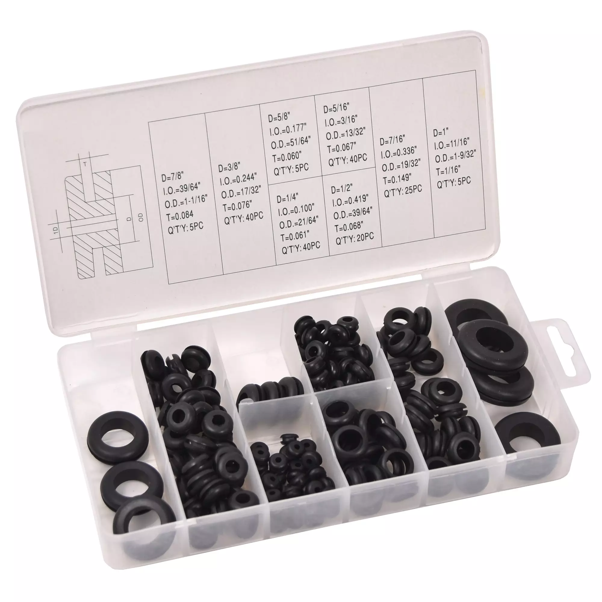 Tuumastorlekts genomföringskit med åtta olika storlekar. Se mer exakta mått i bilden. Innehåller: - 3/16", 40 st - 1/4", 40 st - 3/8", 40 st - 7/16", 25 st - 1/2", 20 st - 5/8", 5 st - 7/8", 5 st - 1", 5 st