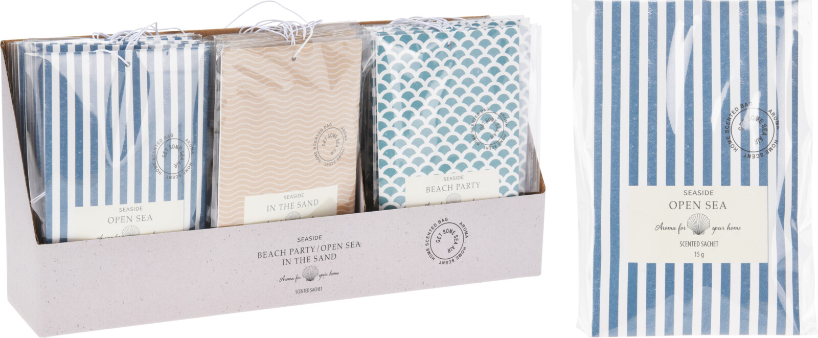 - praktiska doftpåsar, till exempel för garderoben - håller säsongsbetonade textilier och annat fräscht under förvaring - finns i olika dofter (se bild), och vid beställning får du en slumpmässig variant (blandprodukt) - Beach party, In the sand och Open sea - 15 g