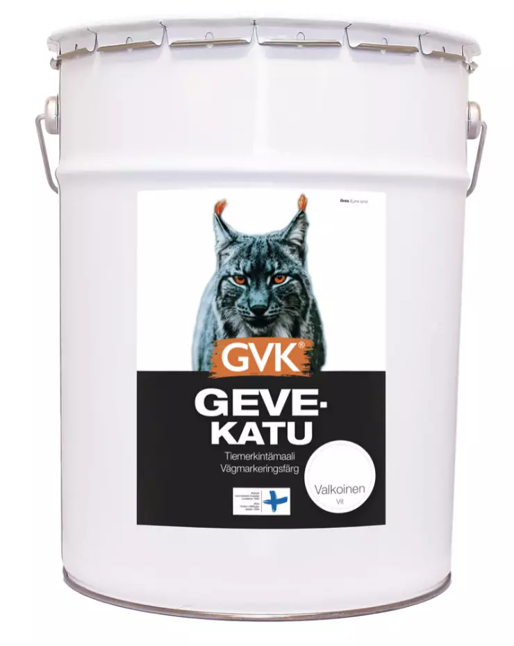 Vattenbaserad vägmarkering som har god täckförmåga och slitstyrka. Torkar på några minuter med accelerator. Gevekatu innehåller inga flyktiga organiska föreningar. Används för märkning av asfalt, oljesand och betong på vägar, flygplatser, lekplatser och parkeringsområden osv. Målartyp: 99 Räckvidd: 1 liter färg räcker till ca 2,8 m². Rekommenderad lagerstjocklek: Blöt film tjocklek ca 350 µm Appliceringsmetod: Appliceras med lågtrycks spruta, roller eller pensel. Torktid: 4-10 min med angiven appliceringsmängd, temperatur över +10 °C och relativ fuktighet under 60%.