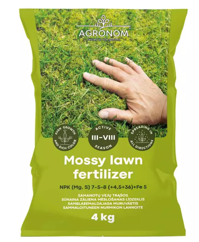 Gödslet är lämpligt för gödsling av mossigt gräs och prydnadsväxter tack vare sin noggrant utvalda sammansättning. Järn- och magnesiumrika gödningsmedel främjar en jämn tillväxt och färg på gräset. Applicera gödningsmedlet efter behov eller lokalt. Vattna efter gödslingen. Gödsla med den rekommenderade mängden 1–3 gånger. Antalet gånger beror på graden av mossighet, dekorationsbehovet och tidpunkten för gödslingen. Gödsla profylaktiskt i början av våren (när temperaturen når +10–12 °C) eller när det finns mossa på gräsmattan. Ta bort (kratta) det bruna mossan. Så om nödvändigt. För att upprätthålla en vacker gräsmatta och reducera mossan rekommenderas en jämn applicering av gödningsmedlet över hela området var 7–8 vecka under växtsäsongen. Gräsmattor som är mottagliga för mossa rekommenderas att kalkas och gödslas extra för att gräset ska förbli frodigt och tätt samt hålla en djupgrön färg. Bruksanvisningar: Mossigt gräs – 5–8 kg / 100 m² (första gången); Mossigt gräs – 5 kg / 100 m² (igen efter 10 dagar); Övervuxet gräs – 4–5 kg / 100 m² (profylaktiskt, 2–3 gånger); Prydnadsväxter – 5–10 kg / 100 m² Använd endast om behov har konstaterats! Överskrid inte doseringen. NPK (Mg,S) 7-5-8 (4,5+36)+Fe