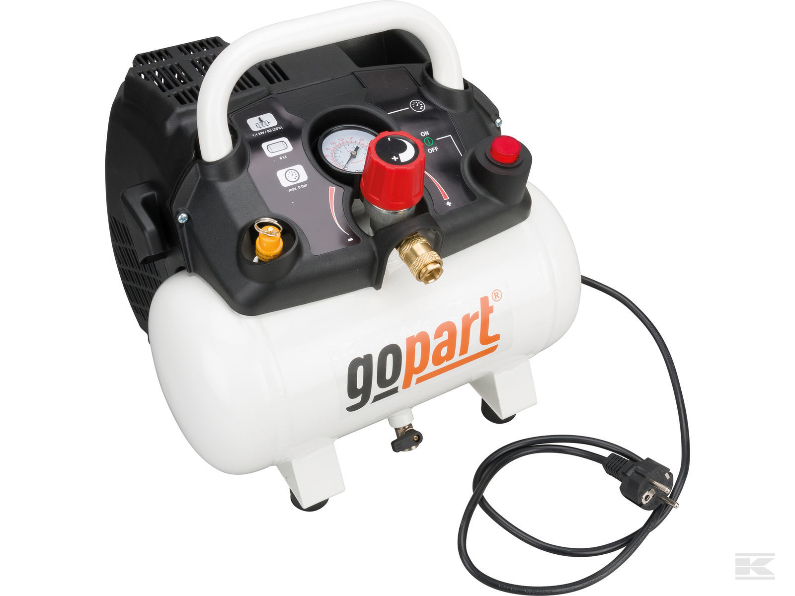 Kompressor GoPart 1,1 kW, 230V - kompakt, bärbar oljevärd kolvkompressor för gör-det-själv-entusiasten - snabbkopplingar: Orion, ISO B, Euro-profil 7,2" - mått: D 360 mm x B 310 mm x H 370 mm - vikt 9,5 kg - varvtal 3400 Rpm/min - kapacitet 120 l/min - max arbetstryck 8 bar - tankvolym 6 l - sugluft 180 l/min - ljudnivå 97 dBA
