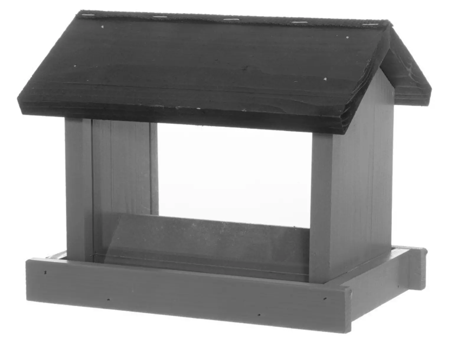 Trädförsedd fågelmatare med genomskinlig plexiglass.