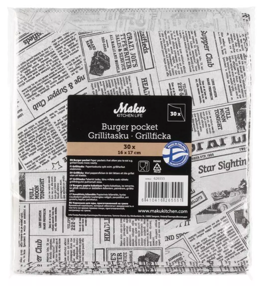 Biurger Pocket hamburgerpåse - Pappersgrillpåse för hamburgare, korv och andra grillrätter. Påsens storlek: 16 x 17 cm. - Bredd17 cm - Djup0,5 cm - Höjd18 cm - Vikt0,07 kg - Färgvit/svart - Materialpapper