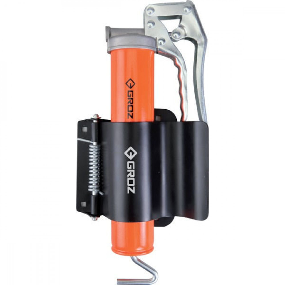 fettpresshållare Groz HD - stark stålstruktur - enkel att fästa - passar alla fettpressar med diameter från Ø57 mm upp till 63,5 mm