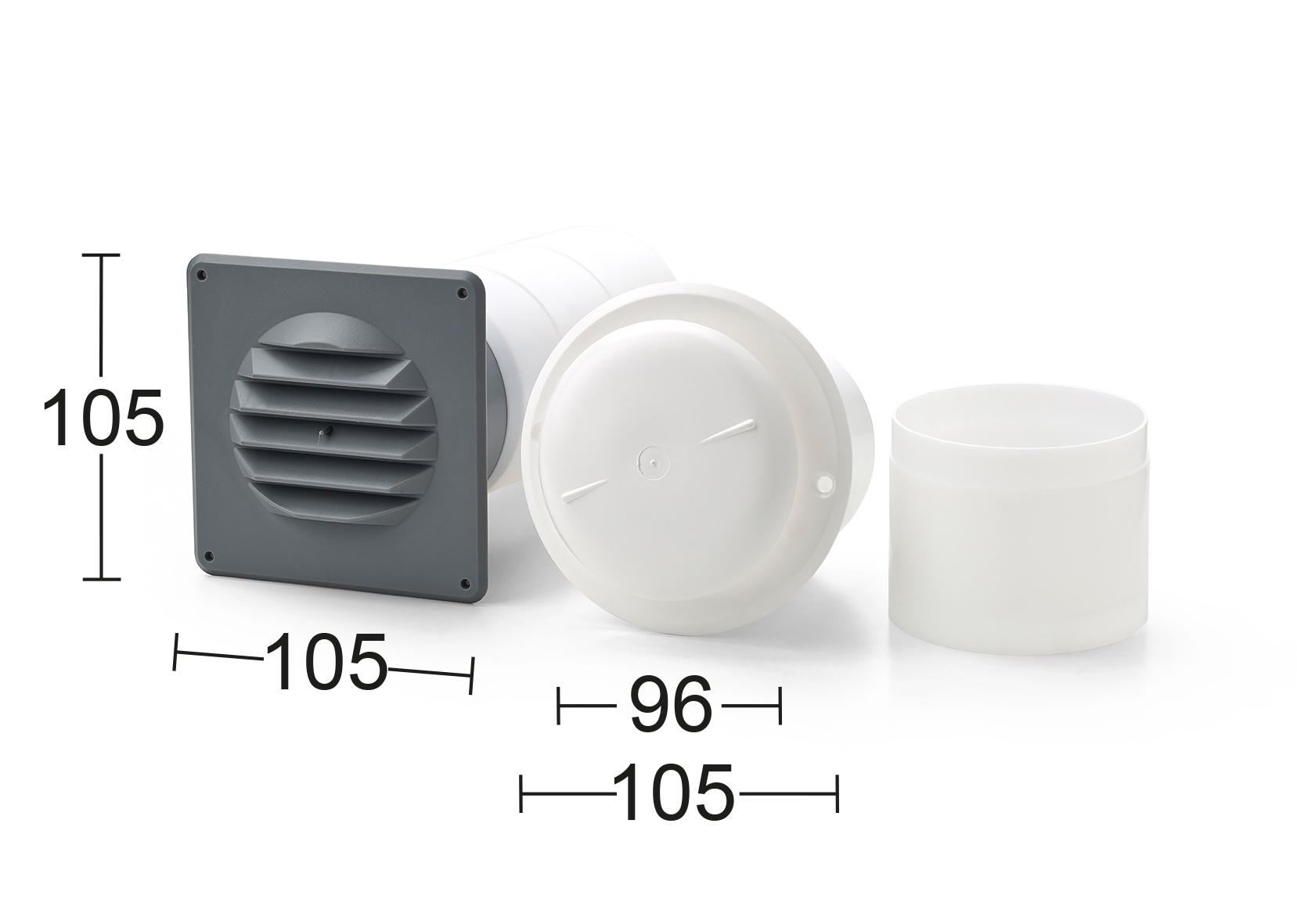 Plastisk teleskopventil för väggar med en tjocklek på 165-310 mm. - rördiameter: 75 mm- färg: vit/grå