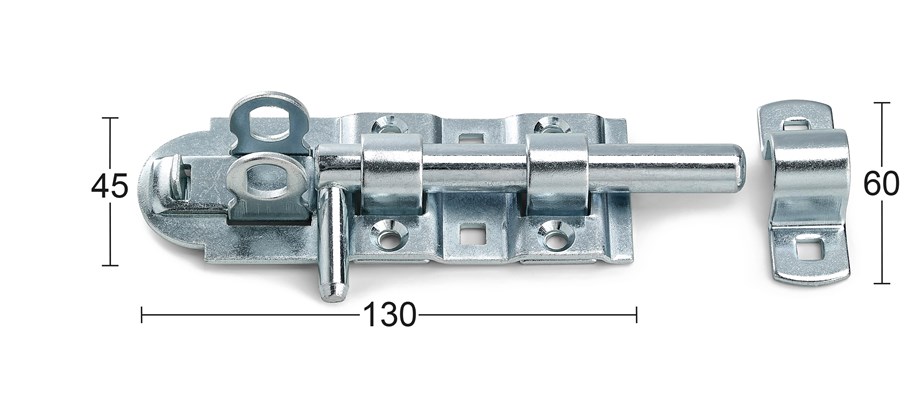 Tryckdörrslås i stål. - låsbart med hänglås, som har en bygel på max 6 mm - tapp Ø 13 mm - inkluderar skruvar - mått enligt bild