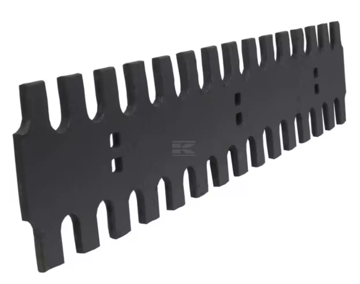 Slitdelarna är tillverkade av specialstål och genomgår en noggrant anpassad värmebehandling som ger hög hårdhet och god seghet. Detta innebär hög slitstyrka och bra förmåga att tåla stötar och slag. - Märke: Hagfors- Tillverkad av UHB BORE-stål- Stålet har hög kromhalt och lägre kolhalt, och bor används som tillsats- Tandade blad levereras med hårdhet HB 500 ( +-25 )- Total bredd: 200 mm- Total längd: 1690 mm- Tjocklek: 12 mm