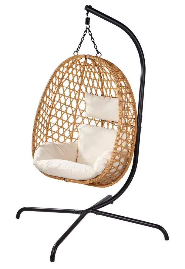 Stilren hängmatta i naturfärgad PE-rotting med en stabil galvaniserad stålram. Inkluderar sittdyna och en mjuk nackkudde med polyesterfyllning.Perfekt för trädgården eller terrassen. Maximala belastning 120 kg.- stativ 105x195 cm- korg 92x59x106 cm- ramens material: pulverlackerad och galvaniserad stål