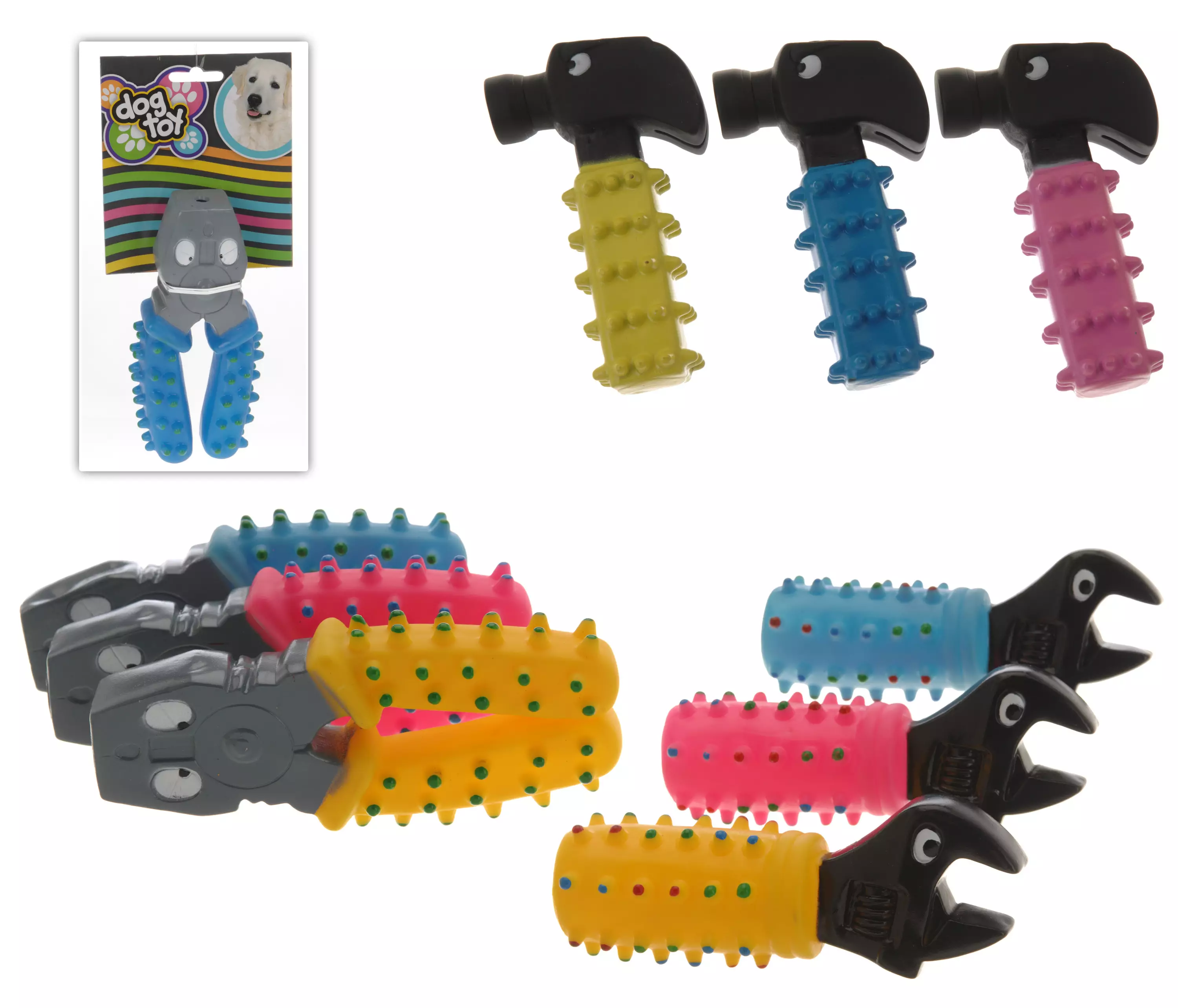 hundens leksak - material: PVC - hammare, tång eller skiftnyckel - färger: rosa, gul och blå - höjd cirka 15 cm