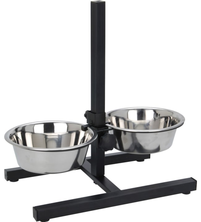 Skålställ med 2 skålar - skål 19 cm, 1,8 liter - avtagbara skålar i lättskött rostfritt stål - justerbar höjd - halkfria fötter - ställets bas: 460 x 280 mm