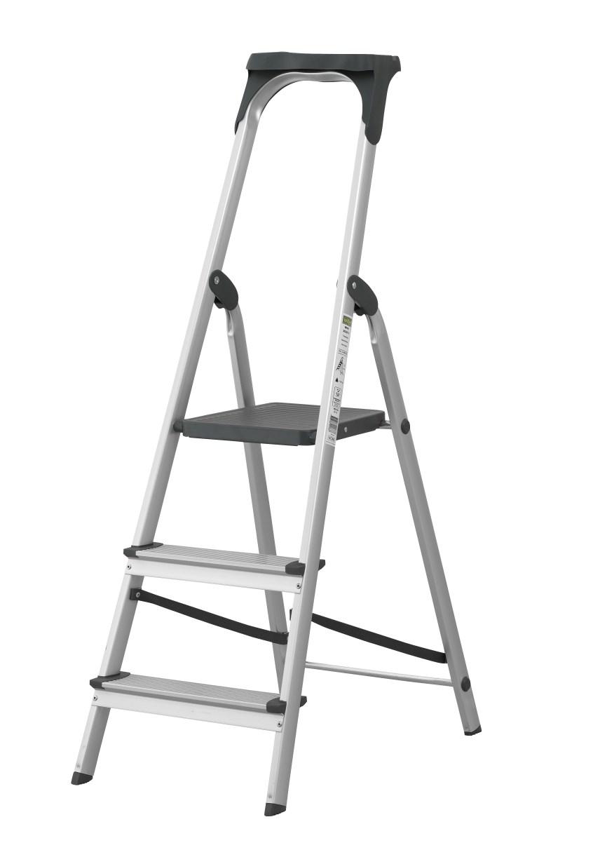 --Kvalitativa, hållbara stegar - Tillräckligt stor plattform - Plattformen fungerar som en lås och stabiliserar stegen - Ribbade, halkfria steg - Stödröret har en praktisk hylla - Anodiserad aluminium - Ståhöjd 0,62 m - Bredd 42,5 cm - Produkten uppfyller gällande europeiska standarder.